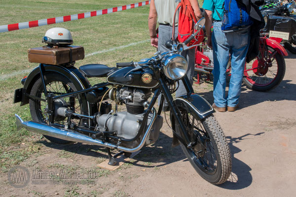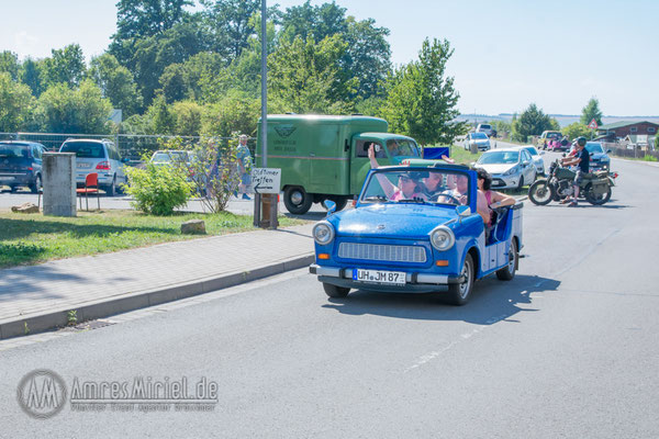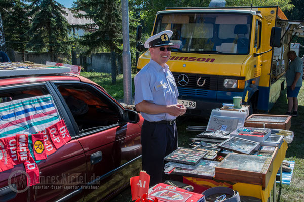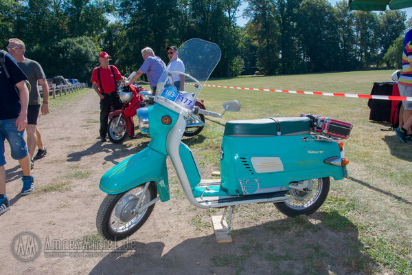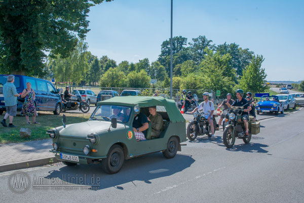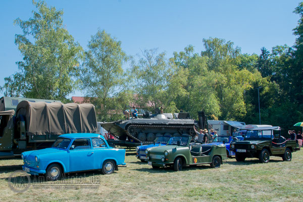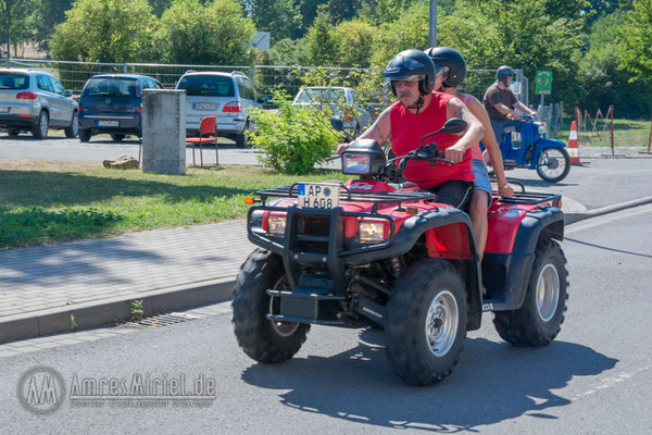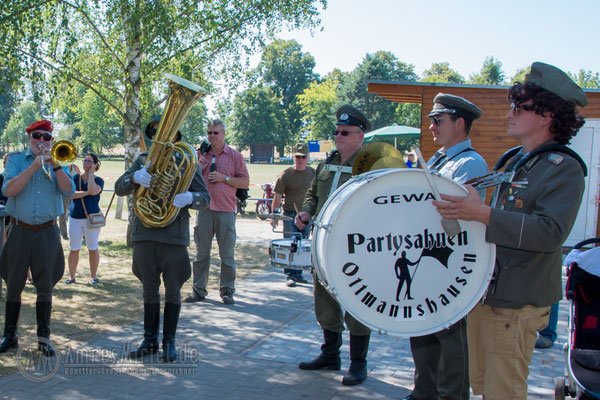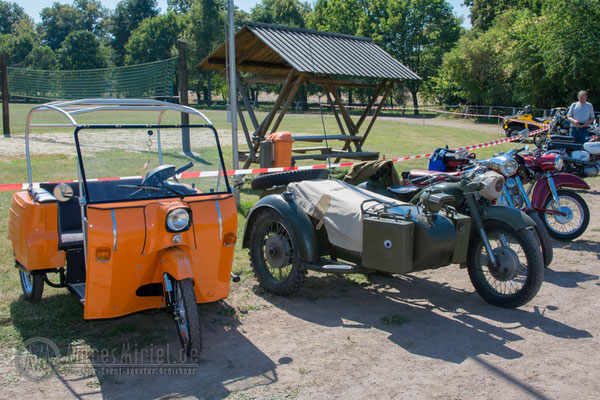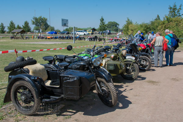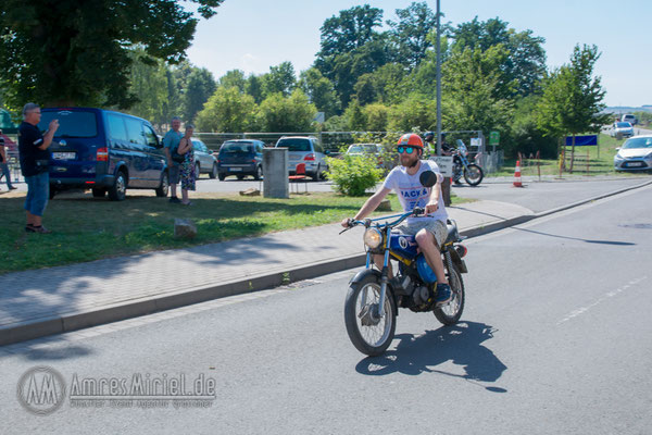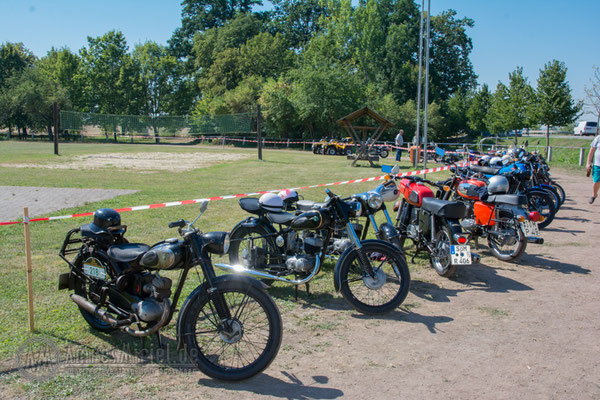 Spiel und Spaß mit Hüpfburg und Wassertank und Spiel-/Mahlstrecke warteten auf die vielen kleinen Gäste zum 6. Oldtimerzweiradtreffen in Eckstedt. Aber auch für die großen gab es wieder allerhand zu sehen. Unter dem Motto: "Futtern wie bei Muttern" brutzelten Würstchen und Brätel auf dem Grill, Kaffee und Kuchen wurden zubereitet und kühle Getränke in Hülle und Fülle für jeder Mann. Ebenfalls wurden große Pavillons als Sonnenschutz aufgestellt. Doch die Abteilung Oldtimer-Freunde des Schützenverein luden nicht nur zum Essen und Trinken ein. Nun mehr lud man bereits zum 6. Treffen aller Zweiradfreunde aus der gesamten Region, gesamt Thüringen und allen anderen Bundesländern Deutschlands ein. Aber auch Aussteller kommen jedes Jahr gern wieder. So waren wieder mit dabei die Oldtimerfreunde aus Erfurt. Sie sind bereits seit 2003 ein eigenständiger Verein. Aber auch viele Freunde und viele bekannte Gesichter der vergangenen Jahre und anderen Zweiradtreffen sah man unter den etwa 150 Teilnehmern an diesem Nachmittag wieder. Aber nicht nur Aussteller von Zweirädern und Oldtimer kamen gern wieder. So sind auch viele der Teilehändler von und für Zweiräder in diesem Jahr bereits zum 6. Mal mit dabei. So auch Herr Schreie mit seinem Uniformen- und Abzeichenstand. Er hat Jahrzehnte lang Dienst- und Abzeichen der DDR gesammelt. Diesen geliebte Hobby musste er leider aufgeben und möchte seine Sammlung an neue Liebhaber der alten Stücke weiter geben. Eines der Highlight unter den Oldtimern war an diesem Tag mit Sicherheit der Panzer von der NVA. Dieser wurde von allen Kindern aber auch von vielen Eltern gern begutachtet und bestaunt. Musikalisches Highlight des Tages waren die Band der Partysahnen aus Ottmannshausen. Stimmungsgeladen machten die Musiker ihrem Namen alle Ehre und brachten die Stimmung unter den Gästen mit Musik aus längst vergangenen Zeiten zum beben. Auf Grunde der anhaltenden Hitze an diesem Samstag reisten viele der Gäste früher ab als gedacht. daher wurde die große Ausfahrt der Oldtimer am Ende schon fast abgesagt. Dennoch entschlossen sich viele der Hitze zu trotzen und den Nachmittag mit einer kleineren Rundfahrt und anschließendem gemütlichen Beisammen sein ausklingen zu lassen.