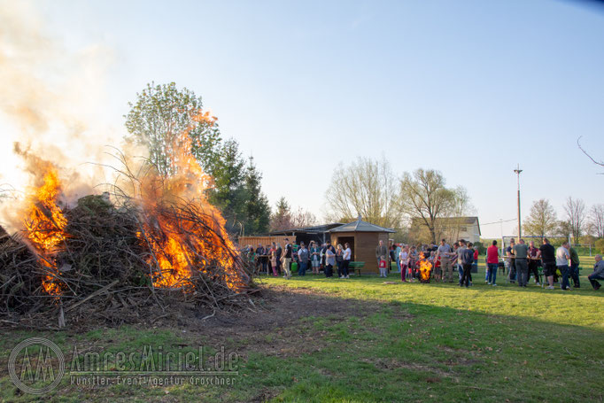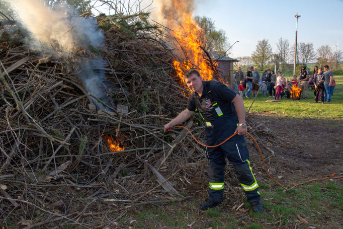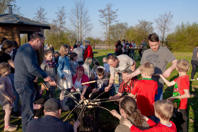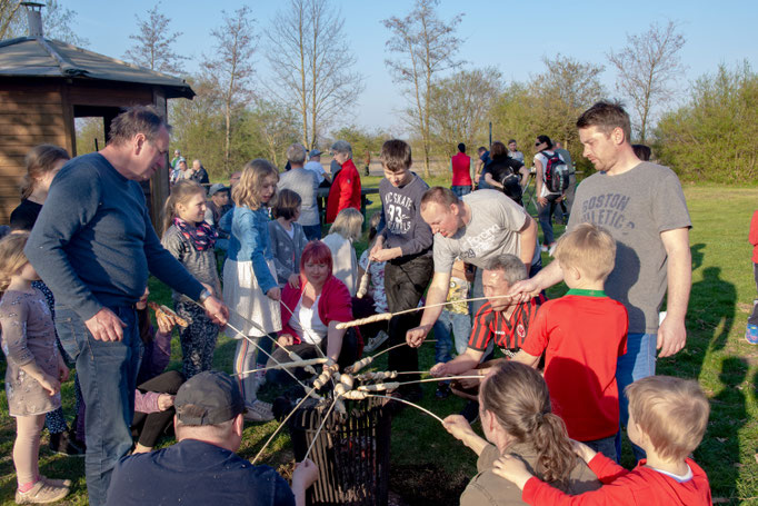 Am österlichen Samstag ab 17uhr lud der Feuerwehrverein aus Ellersleben alle Osterfreunde und Anwohner zum Osterfeuer bei strahlendem Sonnenschein ein. Es gab wie gewohnt frische Würste und Brätel vom Grill und kühle Getränke so dass man bei herrlichen 23grad in der Sonne gemütlich zusammensitzen konnte, bis gegen 19uhr das traditionelle Osterfeuer entzündet wurde. Zuvor konnten alle kleinen Gäste noch versteckte Ostereier auf dem Sportplatzgelände suche und sich Stockbrot über der Feuerschale machen.