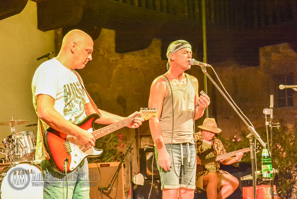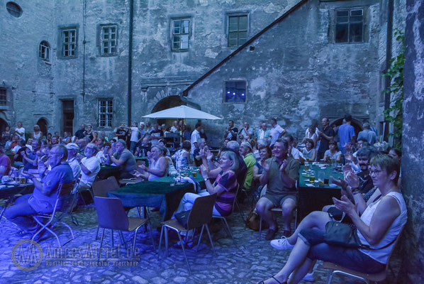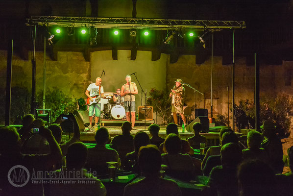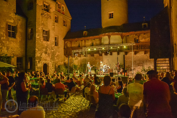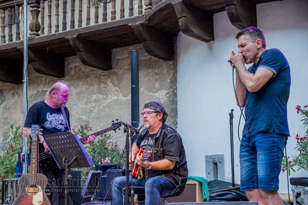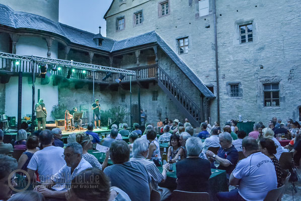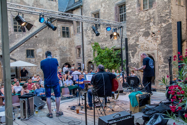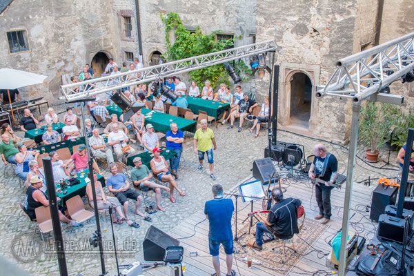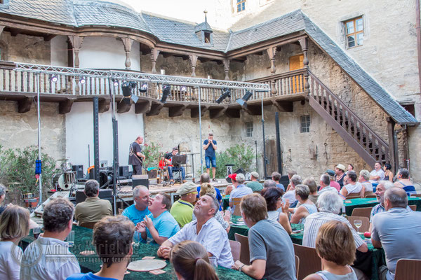 Kannawurf den 27.08.2016: um 15 Uhr begann am Samstagnachmittag das 6. Bluesfest auf Schloss in Kannawurf. Trotz des warmen sehr sonnigen Wetter kamen schon am Nachmittag viel Gäste um Dieter Gunia spielen zu hören. Doch aufgrund der anhaltend warmen Witterung füllten sich nur nach und nach die Stühle an den Tischen im Innenhof. Zwar war ein großer Teil der Sitzplätze belegt doch der Besucherstrom kam erst gegen Abend, als die Sonne zu sinken begann und es ein wenig kühler wurde. So wurden weitere Stühle aufgestellt um möglichst vielen Gästen einen Sitzplatz anbieten zu können. Was viele der bereits erschienenen Gäste bemerkten, im Innenhof des Schlosses war es wesentlich angenehmer als draußen vor dem Tor. Mit Wolle & Friends das Bluestrio, Jolly Joker und der Michael-Lehnhardt-Band lud sich des Künstlerhaus Thüringen in diesem Jahr wieder bekannte Künstler der Bluesmusik ein. Viele Freunde des Künstlerhaus Thüringen die schon seit vielen Jahren regelmäßig Veranstaltungen im SchlossHof besuchen, ließen sich diesen Nachmittag nicht entgehen, im Anschluss zum Konzertteil, zur gemütlichen Blues-Session mit allen Gästen über zu gehen. Natürlich nur, welche auch Lust darauf hatten über.