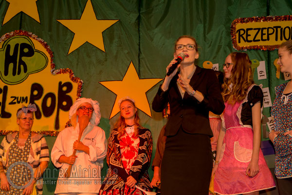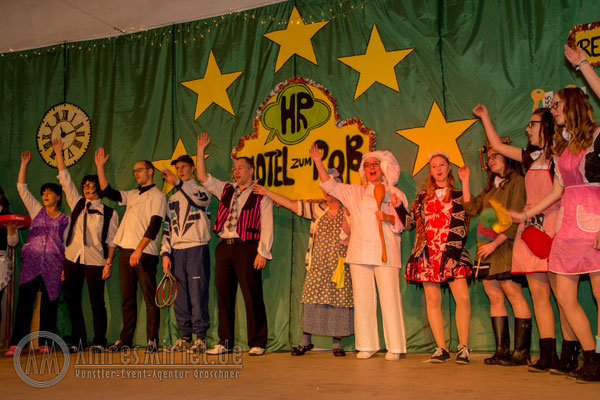 Dekoration der Bühne aber auch des Saals gesteckt. Viele selbstgebastelte und bemalte Schilder. Auch die 5 Sterne für die Auszeichnung des Hotels zum „First-Class Hotel“ wurden Angebracht. Und so